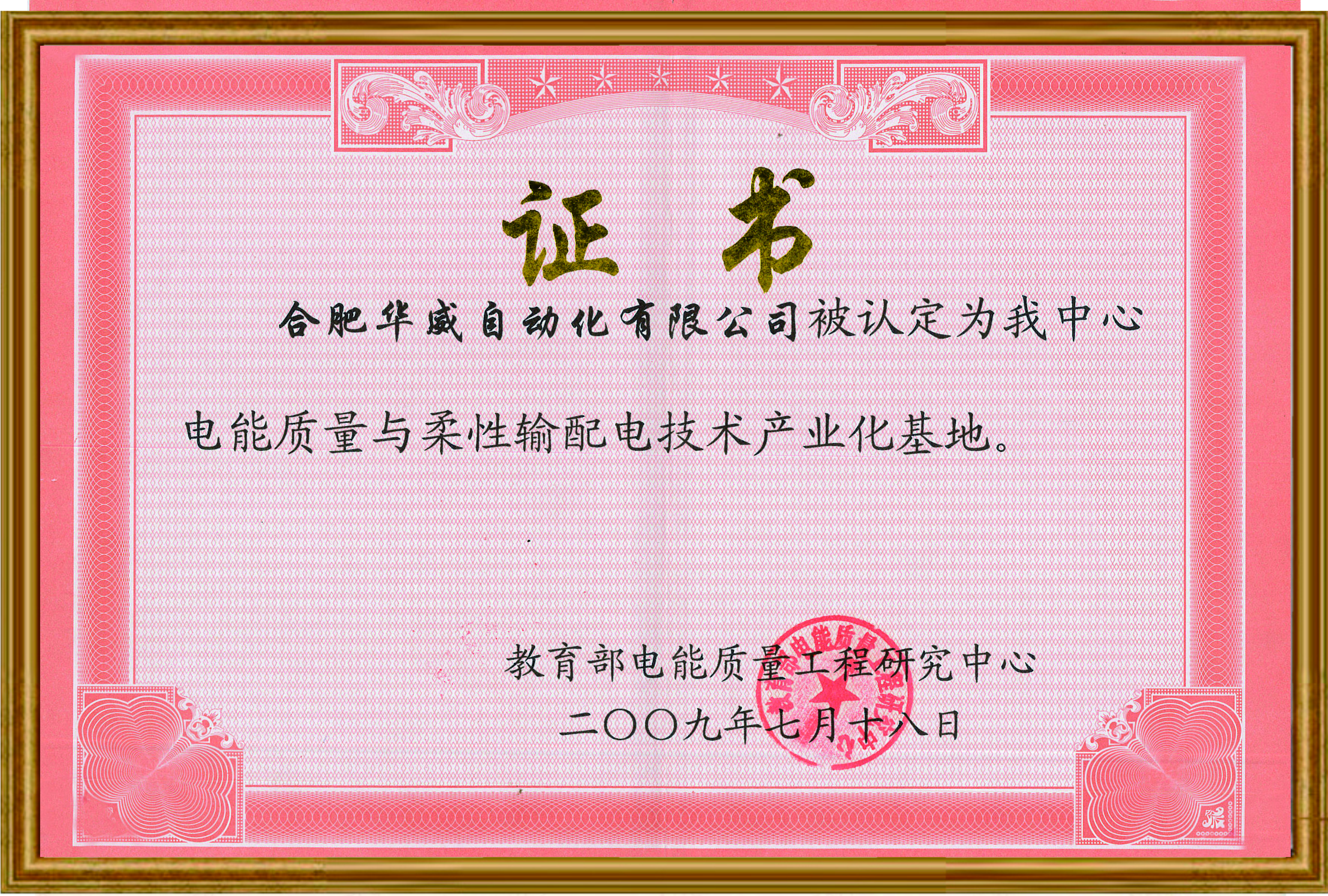 電能質(zhì)量與柔性輸配電技術(shù)產(chǎn)業(yè)化基地證書